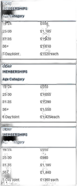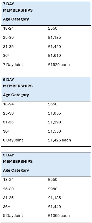 6-Day Memberships: Intermediate Categories available on request